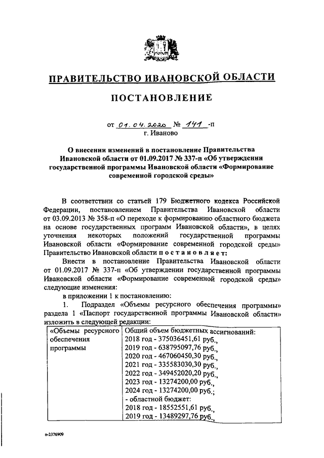 Постановление Правительства Ивановской области от 01.04.2020 N 141-п "О внесении изменений в постановление Правительства Ивановской области от 01.09.2017 N 337-п "Об утверждении государственной программы Ивановской области "Формирование современной городской среды" (вместе с "Порядком предоставления и распределения субсидий бюджетам муниципальных образований Ивановской области на реализацию проектов благоустройства территорий муниципальных образований Ивановской области")
