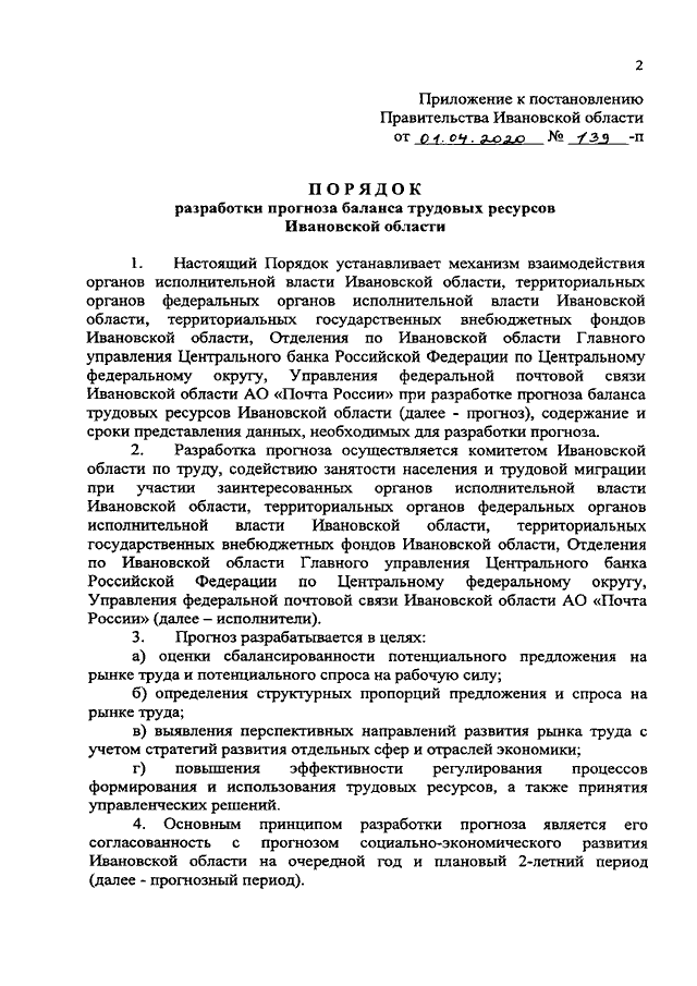 Постановление Правительства Ивановской области от 01.04.2020 N 139-п "О разработке прогноза баланса трудовых ресурсов Ивановской области" (вместе с "Порядком разработки прогноза баланса трудовых ресурсов Ивановской области")