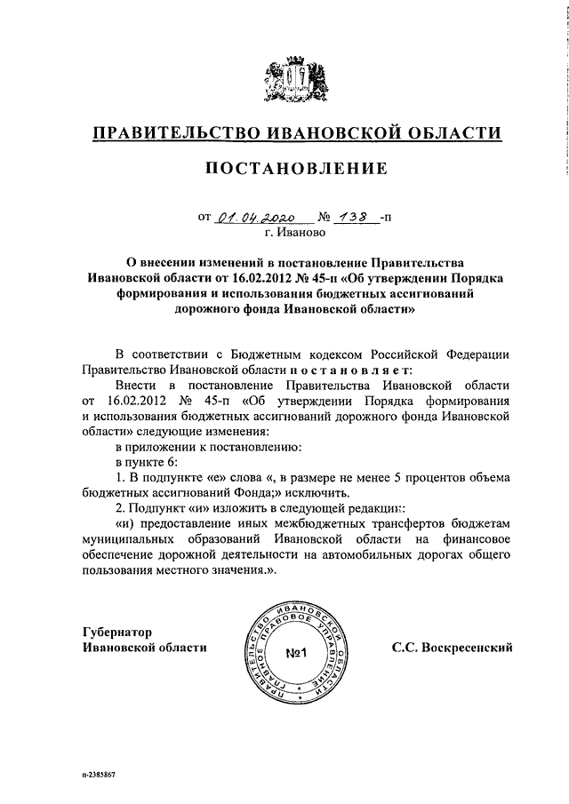 Постановление Правительства Ивановской области от 01.04.2020 N 138-п "О внесении изменений в постановление Правительства Ивановской области от 16.02.2012 N 45-п "Об утверждении Порядка формирования и использования бюджетных ассигнований дорожного фонда Ивановской области"