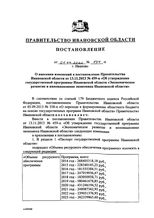 Постановление Правительства Ивановской области от 01.04.2020 N 134-п "О внесении изменений в постановление Правительства Ивановской области от 13.11.2013 N 459-п "Об утверждении государственной программы Ивановской области "Экономическое развитие и инновационная экономика Ивановской области"