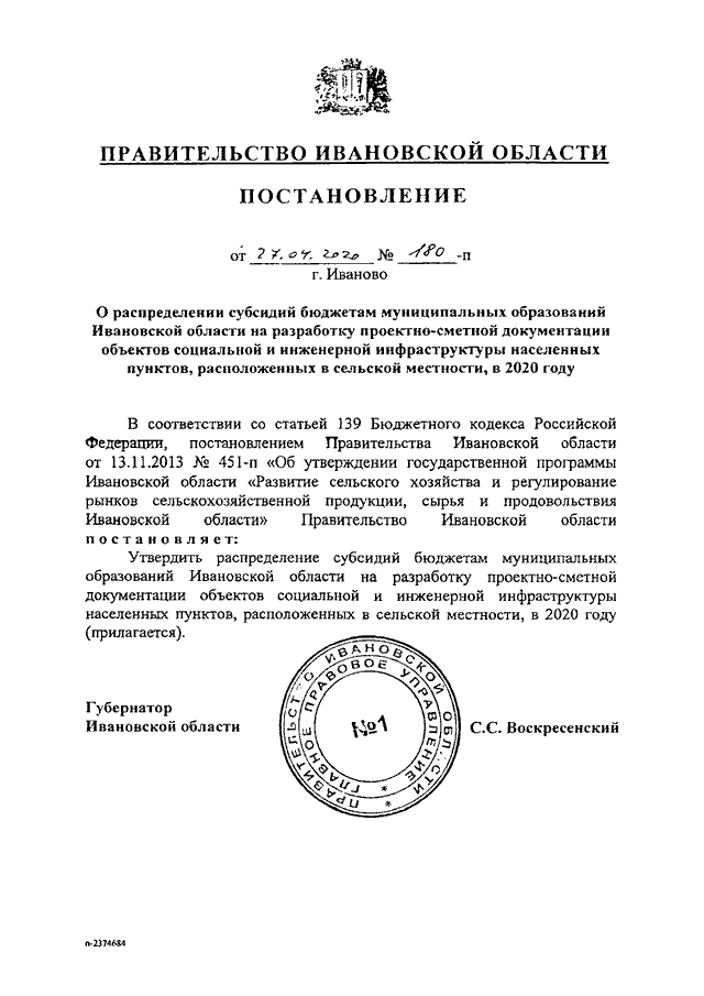 Постановление Правительства Ивановской области от 27.04.2020 N 180-п "О распределении субсидий бюджетам муниципальных образований Ивановской области на разработку проектно-сметной документации объектов социальной и инженерной инфраструктуры населенных пунктов, расположенных в сельской местности, в 2020 году"