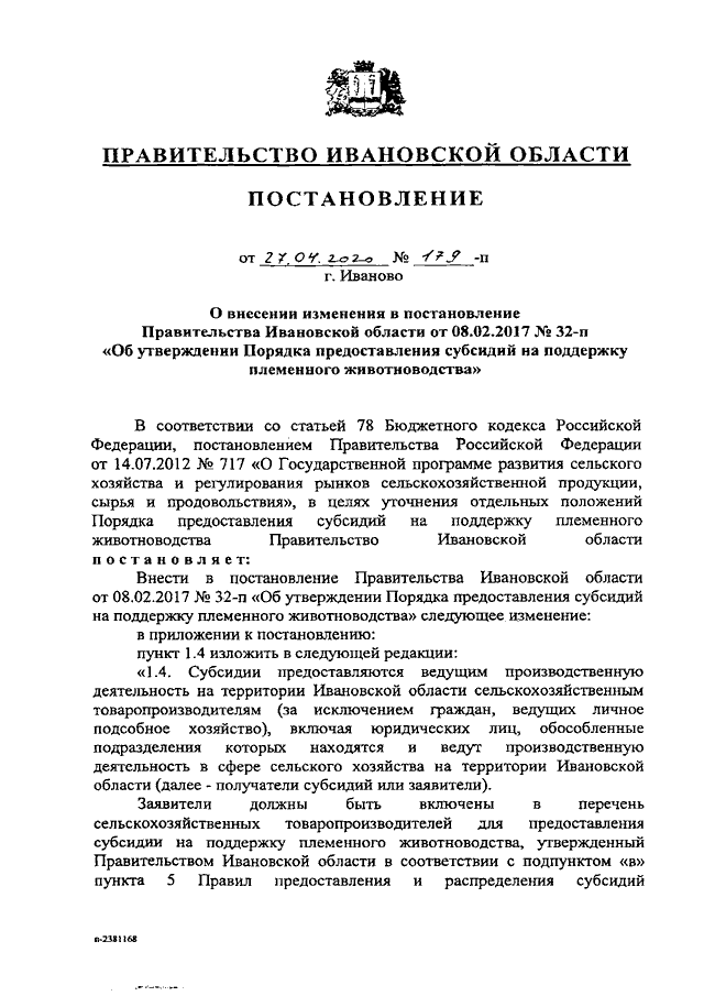 Постановление Правительства Ивановской области от 27.04.2020 N 179-п "О внесении изменения в постановление Правительства Ивановской области от 08.02.2017 N 32-п "Об утверждении Порядка предоставления субсидий на поддержку племенного животноводства"