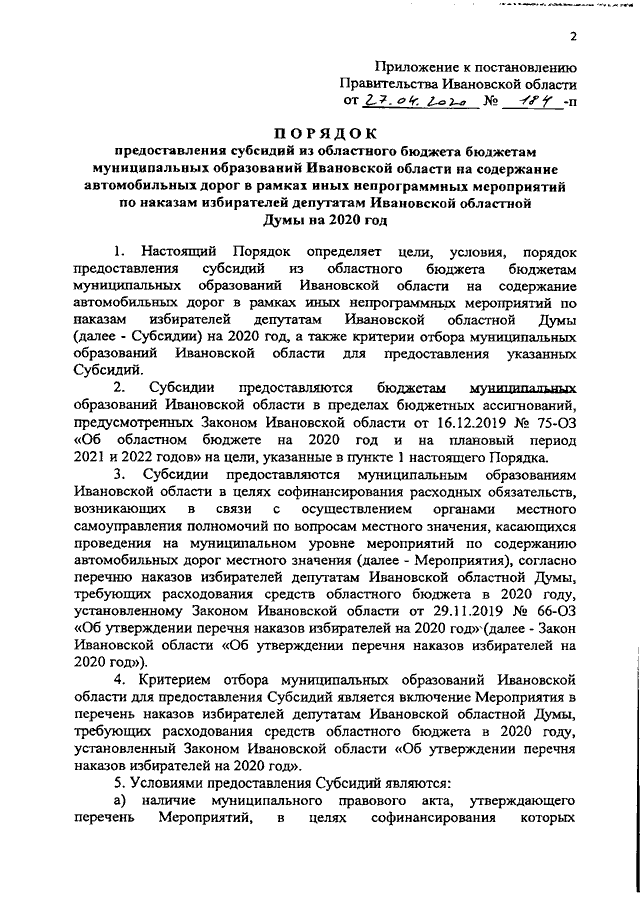 Постановление Правительства Ивановской области от 27.04.2020 N 184-п "Об утверждении Порядка предоставления субсидий из областного бюджета бюджетам муниципальных образований Ивановской области на содержание автомобильных дорог в рамках иных непрограммных мероприятий по наказам избирателей депутатам Ивановской областной Думы на 2020 год"