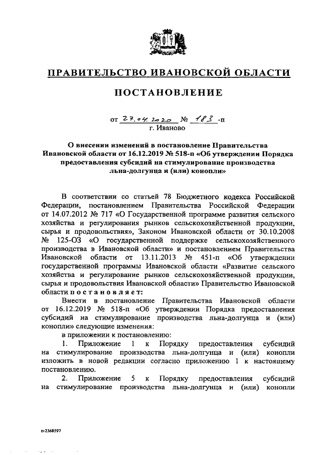 Постановление Правительства Ивановской области от 27.04.2020 N 183-п "О внесении изменений в постановление Правительства Ивановской области от 16.12.2019 N 518-п "Об утверждении Порядка предоставления субсидий на стимулирование производства льна-долгунца и (или) конопли"