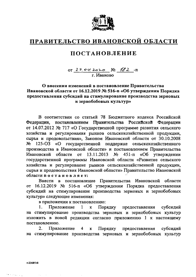 Постановление Правительства Ивановской области от 27.04.2020 N 182-п "О внесении изменений в постановление Правительства Ивановской области от 16.12.2019 N 516-п "Об утверждении Порядка предоставления субсидий на стимулирование производства зерновых и зернобобовых культур"