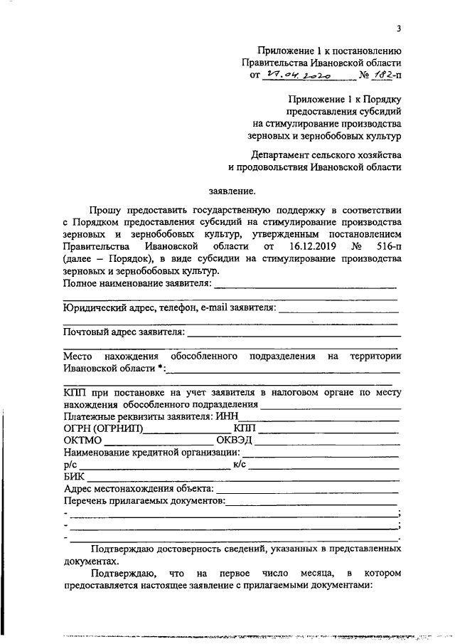 Постановление Правительства Ивановской области от 27.04.2020 N 182-п "О внесении изменений в постановление Правительства Ивановской области от 16.12.2019 N 516-п "Об утверждении Порядка предоставления субсидий на стимулирование производства зерновых и зернобобовых культур"