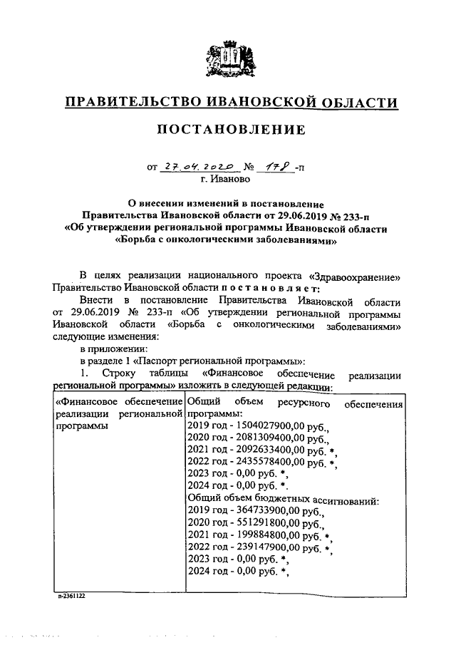 Постановление Правительства Ивановской области от 27.04.2020 N 178-п "О внесении изменений в постановление Правительства Ивановской области от 29.06.2019 N 233-п "Об утверждении региональной программы Ивановской области "Борьба с онкологическими заболеваниями"