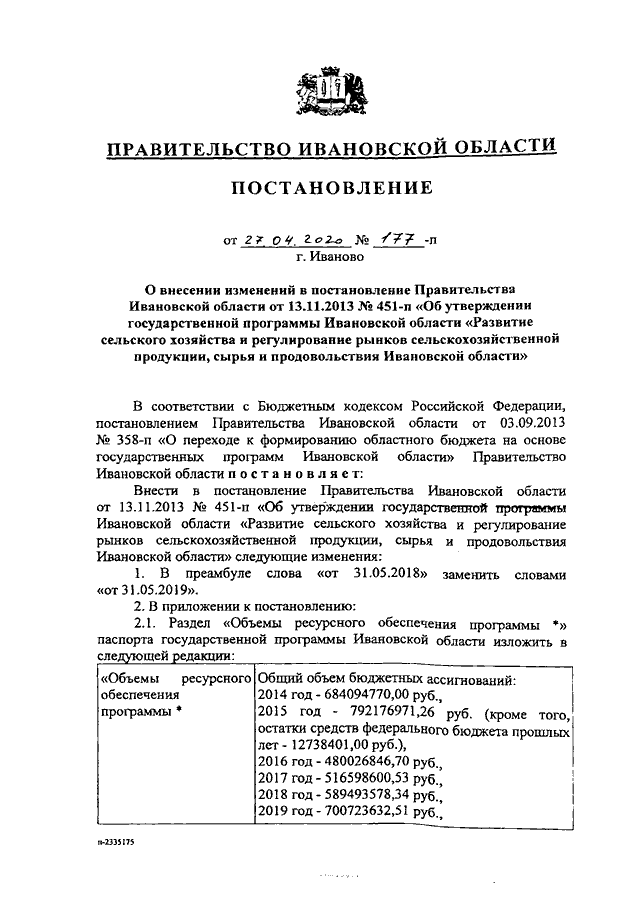 Постановление Правительства Ивановской области от 27.04.2020 N 177-п "О внесении изменений в постановление Правительства Ивановской области от 13.11.2013 N 451-п "Об утверждении государственной программы Ивановской области "Развитие сельского хозяйства и регулирование рынков сельскохозяйственной продукции, сырья и продовольствия Ивановской области"