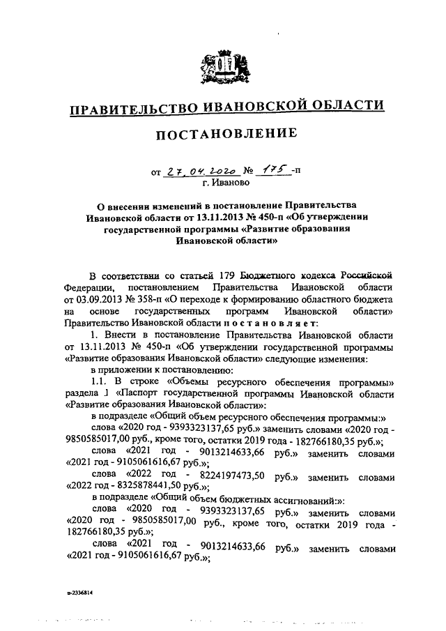 Постановление Правительства Ивановской области от 27.04.2020 N 175-п "О внесении изменений в постановление Правительства Ивановской области от 13.11.2013 N 450-п "Об утверждении государственной программы "Развитие образования Ивановской области" (вместе с "Порядком предоставления и распределения субсидий бюджетам муниципальных образований Ивановской области на строительство объектов общего образования", "Порядком предоставления и распределения субсидий бюджетам муниципальных районов и городских округов Ивановской области на создание в общеобразовательных организациях Ивановской области, расположенных в сельской местности и малых городах, условий для занятий физической культурой и спортом", "Порядком предоставления и распределения субсидий бюджетам муниципальных образований Ивановской области на реализацию мероприятий по созданию дополнительных мест для детей в возрасте от 1,5 до 3 лет в образовательных организациях, осуществляющих образовательную деятельность по образовательным программам дошкольного образования", "Порядком предоставления и распределения субсидий бюджетам муниципальных районов и городских округов Ивановской области на реализацию мероприятий по модернизации муниципальных детских школ искусств по видам искусств")