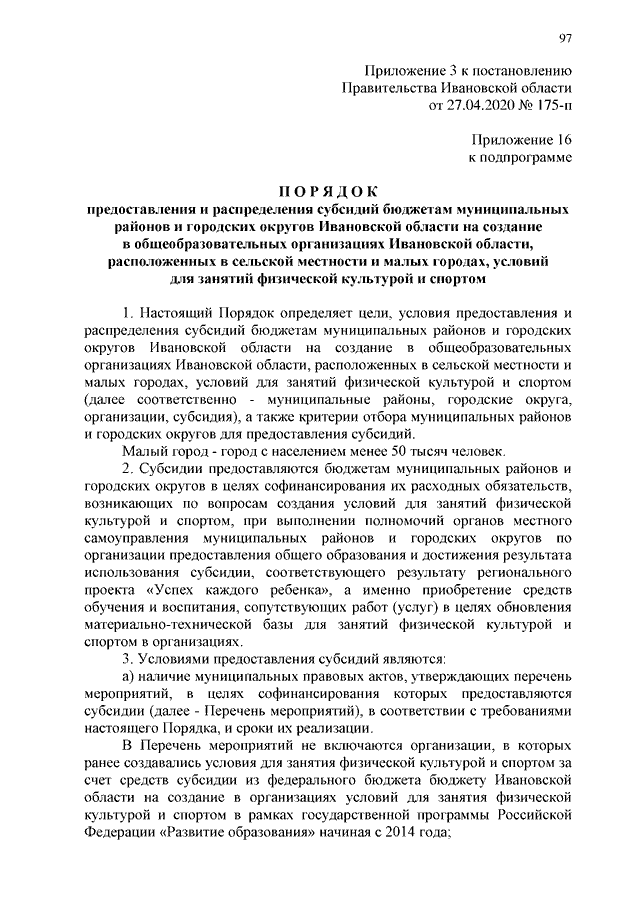 Постановление Правительства Ивановской области от 27.04.2020 N 175-п "О внесении изменений в постановление Правительства Ивановской области от 13.11.2013 N 450-п "Об утверждении государственной программы "Развитие образования Ивановской области" (вместе с "Порядком предоставления и распределения субсидий бюджетам муниципальных образований Ивановской области на строительство объектов общего образования", "Порядком предоставления и распределения субсидий бюджетам муниципальных районов и городских округов Ивановской области на создание в общеобразовательных организациях Ивановской области, расположенных в сельской местности и малых городах, условий для занятий физической культурой и спортом", "Порядком предоставления и распределения субсидий бюджетам муниципальных образований Ивановской области на реализацию мероприятий по созданию дополнительных мест для детей в возрасте от 1,5 до 3 лет в образовательных организациях, осуществляющих образовательную деятельность по образовательным программам дошкольного образования", "Порядком предоставления и распределения субсидий бюджетам муниципальных районов и городских округов Ивановской области на реализацию мероприятий по модернизации муниципальных детских школ искусств по видам искусств")