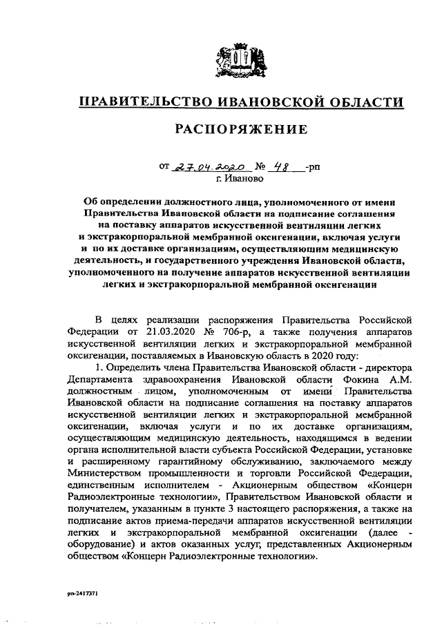 Распоряжение Правительства Ивановской области от 27.04.2020 N 48-рп "Об определении должностного лица, уполномоченного от имени Правительства Ивановской области на подписание соглашения на поставку аппаратов искусственной вентиляции легких и экстракорпоральной мембранной оксигенации, включая услуги и по их доставке организациям, осуществляющим медицинскую деятельность, и государственного учреждения Ивановской области, уполномоченного на получение аппаратов искусственной вентиляции легких и экстракорпоральной мембранной оксигенации"