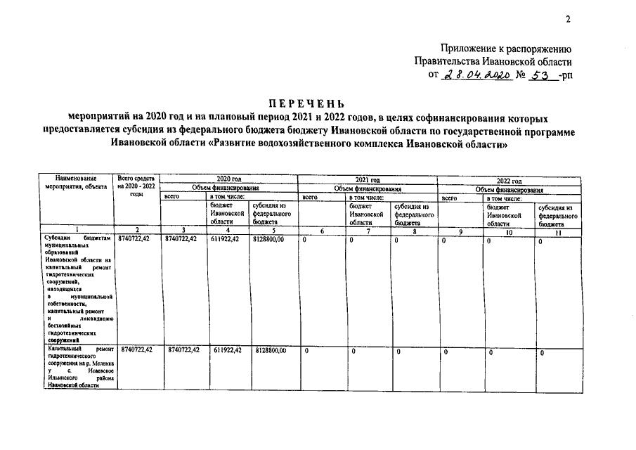 Распоряжение Правительства Ивановской области от 28.04.2020 N 53-рп "Об утверждении перечня мероприятий на 2020 год и на плановый период 2021 и 2022 годов, в целях софинансирования которых предоставляется субсидия из федерального бюджета бюджету Ивановской области по государственной программе Ивановской области "Развитие водохозяйственного комплекса Ивановской области"
