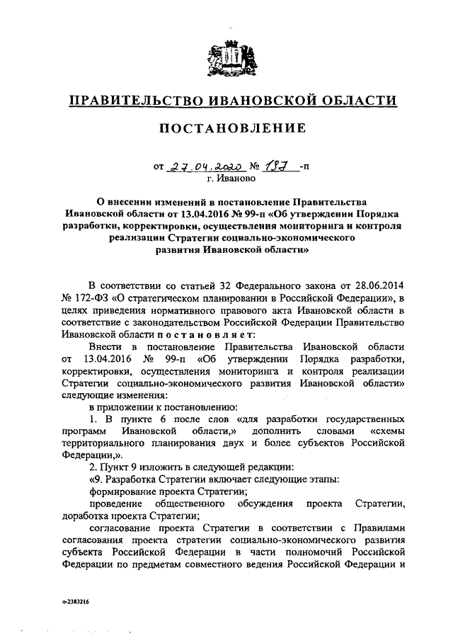 Постановление Правительства Ивановской области от 27.04.2020 N 197-п "О внесении изменений в постановление Правительства Ивановской области от 13.04.2016 N 99-п "Об утверждении Порядка разработки, корректировки, осуществления мониторинга и контроля реализации Стратегии социально-экономического развития Ивановской области"