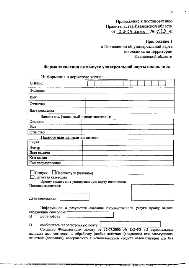 Постановление Правительства Ивановской области от 27.04.2020 N 193-п "О внесении изменений в постановление Правительства Ивановской области от 11.09.2013 N 363-п "Об утверждении Положения об универсальной карте школьника на территории Ивановской области"