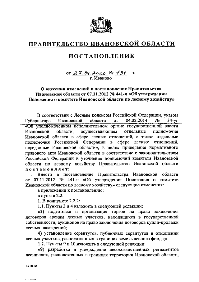Постановление Правительства Ивановской области от 27.04.2020 N 191-п "О внесении изменений в постановление Правительства Ивановской области от 07.11.2012 N 441-п "Об утверждении Положения о комитете Ивановской области по лесному хозяйству"