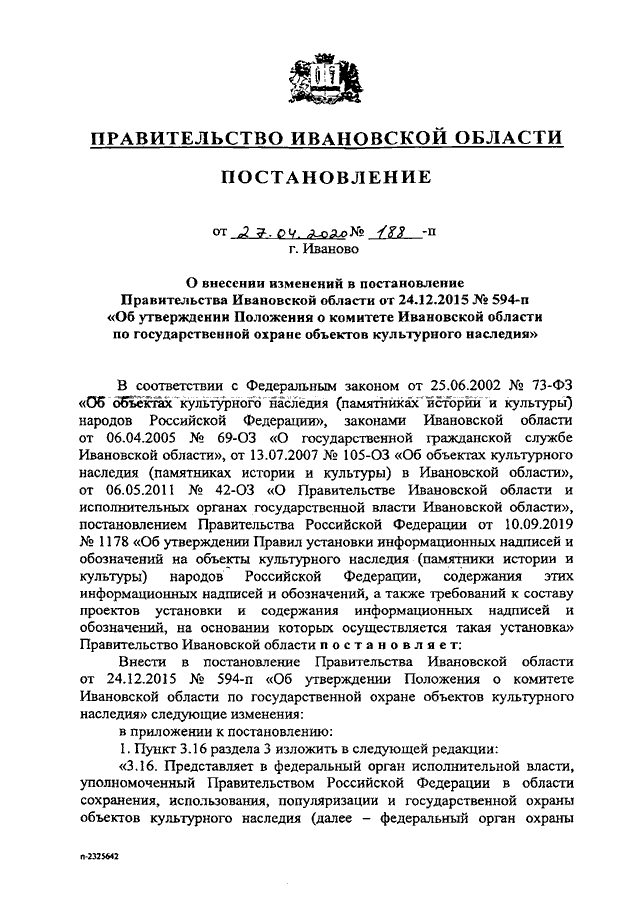 Постановление Правительства Ивановской области от 27.04.2020 N 188-п "О внесении изменений в постановление Правительства Ивановской области от 24.12.2015 N 594-п "Об утверждении Положения о комитете Ивановской области по государственной охране объектов культурного наследия"