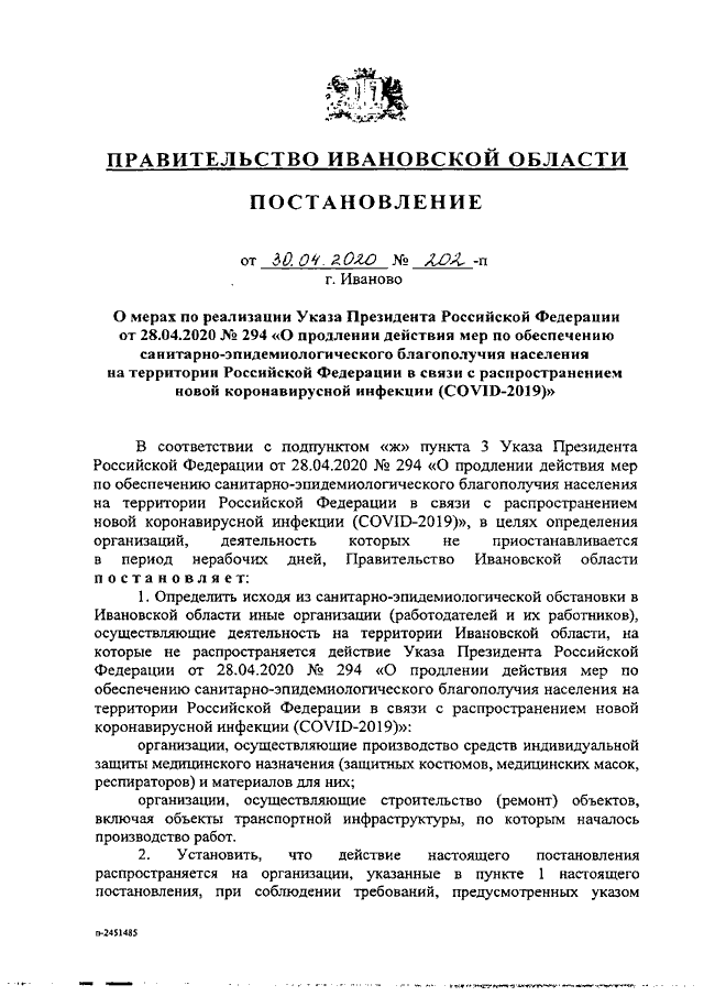 Постановление Правительства Ивановской области от 30.04.2020 N 202-п "О мерах по реализации Указа Президента Российской Федерации от 28.04.2020 N 294 "О продлении действия мер по обеспечению санитарно-эпидемиологического благополучия населения на территории Российской Федерации в связи с распространением новой коронавирусной инфекции (COVID-2019)"