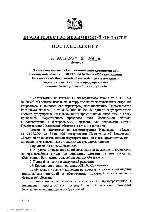 Постановление Правительства Ивановской области от 30.04.2020 N 206-п "О внесении изменений в постановление администрации Ивановской области от 28.07.2004 N 84-па "Об утверждении Положения об Ивановской областной подсистеме единой государственной системы предупреждения и ликвидации чрезвычайных ситуаций"