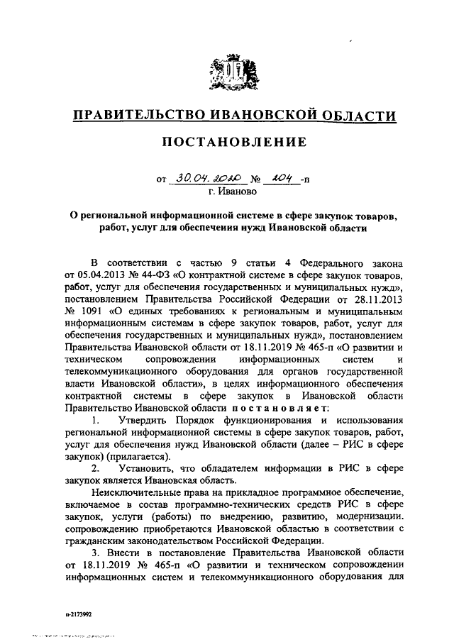 Постановление Правительства Ивановской области от 30.04.2020 N 204-п "О региональной информационной системе в сфере закупок товаров, работ, услуг для обеспечения нужд Ивановской области" (вместе с "Порядком функционирования и использования региональной информационной системы в сфере закупок товаров, работ, услуг для обеспечения нужд Ивановской области")