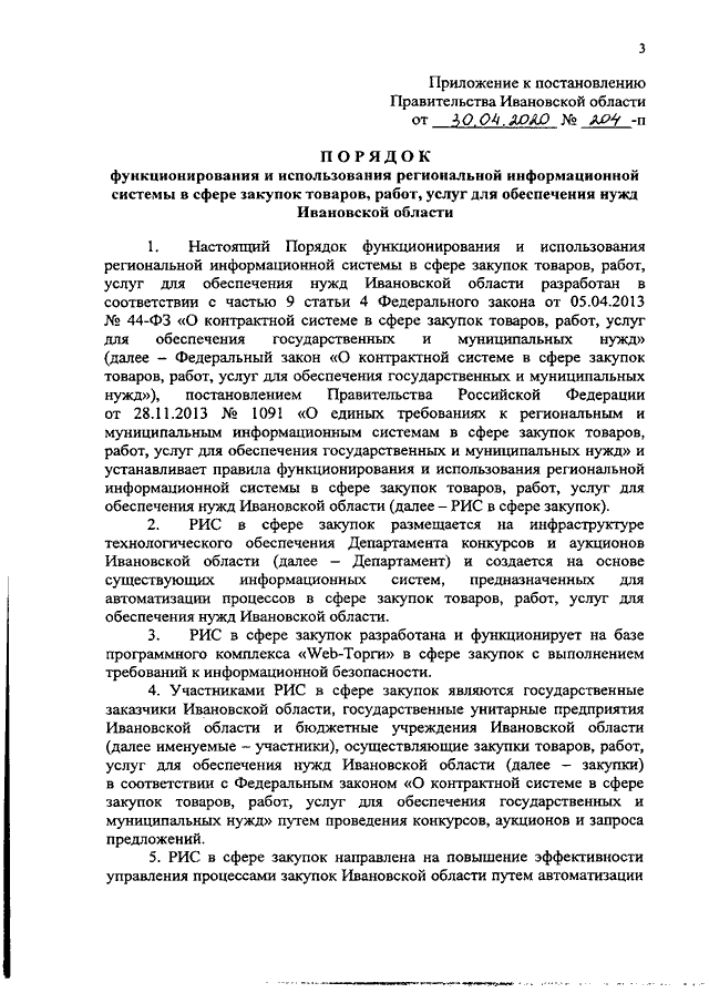 Постановление Правительства Ивановской области от 30.04.2020 N 204-п "О региональной информационной системе в сфере закупок товаров, работ, услуг для обеспечения нужд Ивановской области" (вместе с "Порядком функционирования и использования региональной информационной системы в сфере закупок товаров, работ, услуг для обеспечения нужд Ивановской области")