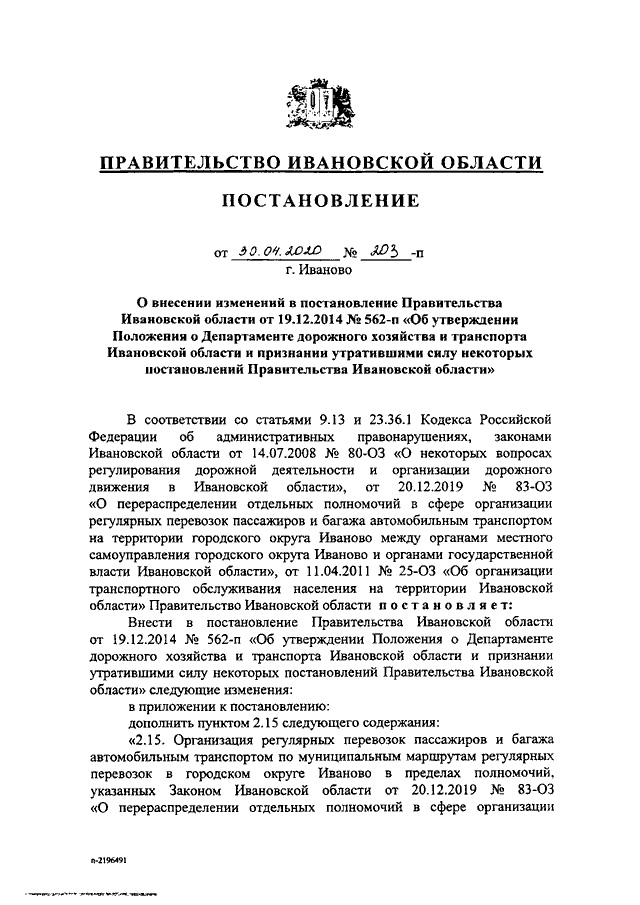 Постановление Правительства Ивановской области от 30.04.2020 N 203-п "О внесении изменений в постановление Правительства Ивановской области от 19.12.2014 N 562-п "Об утверждении Положения о Департаменте дорожного хозяйства и транспорта Ивановской области и признании утратившими силу некоторых постановлений Правительства Ивановской области"