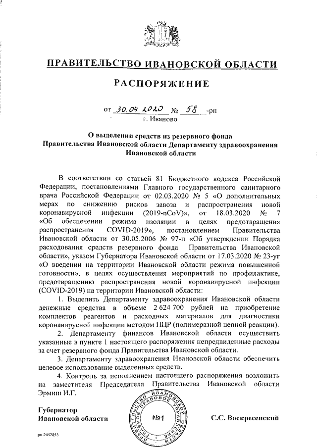 Распоряжение Правительства Ивановской области от 30.04.2020 N 58-рп "О выделении средств из резервного фонда Правительства Ивановской области Департаменту здравоохранения Ивановской области"