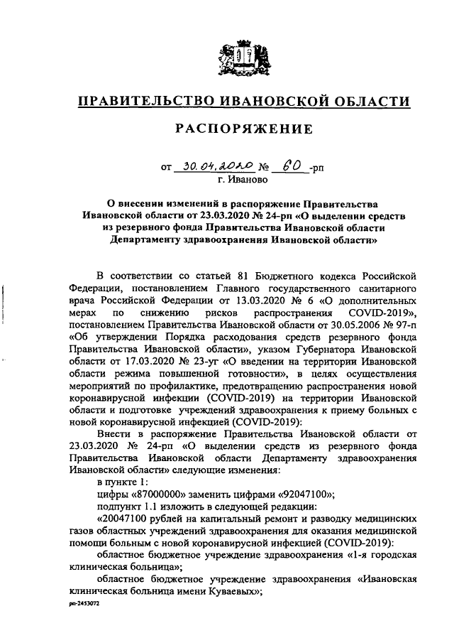 Распоряжение Правительства Ивановской области от 30.04.2020 N 60-рп "О внесении изменений в распоряжение Правительства Ивановской области от 23.03.2020 N 24-рп "О выделении средств из резервного фонда Правительства Ивановской области Департаменту здравоохранения Ивановской области"