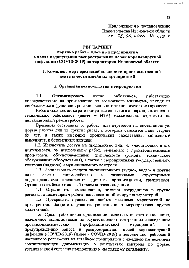 Постановление Правительства Ивановской области от 08.05.2020 N 209-п "Об утверждении регламентов по проведению профилактических мероприятий и дезинфекции в целях недопущения распространения новой коронавирусной инфекции (COVID-2019) на территории Ивановской области" (вместе с "Регламентом порядка работы предприятий промышленности в целях недопущения распространения новой коронавирусной инфекции (COVID-2019) на территории Ивановской области", "Регламентом порядка работы предприятий пищевой промышленности в целях недопущения распространения новой коронавирусной инфекции (COVID-2019) на территории Ивановской области", "Регламентом порядка работы предприятий текстильной промышленности в целях недопущения распространения новой коронавирусной инфекции (COVID-2019) на территории Ивановской области", "Регламентом порядка работы швейных предприятий в целях недопущения распространения новой коронавирусной инфекции (COVID-2019) на территории Ивановской области", "Регламентом порядка работы и предоставления услуг по перевозке пассажиров и багажа автомобильным транспортом и городским наземным электрическим транспортом в целях недопущения распространения новой коронавирусной инфекции (COVID-2019) на территории Ивановской области", "Регламентом порядка работы и предоставления услуг организациями, эксплуатирующими автозаправочные станции и комплексы, в целях недопущения распространения новой коронавирусной инфекции (COVID-2019) на территории Ивановской области", "Регламентом порядка работы и предоставления услуг по перевозке пассажиров и багажа легковым такси в целях недопущения распространения новой коронавирусной инфекции (COVID-2019) на территории Ивановской области", "Регламентом порядка работы предприятий сферы услуг в целях недопущения распространения новой коронавирусной инфекции (COVID-2019) на территории Ивановской области", "Регламентом порядка работы образовательных организаций, реализующих основные образовательные программы дошкольного образования, в целях недопущения распространения новой коронавирусной инфекции (COVID-19) на территории Ивановской области", "Регламентом порядка работы по проведению профилактических мероприятий и дезинфекции организаций, оказывающих парикмахерские и косметические услуги, в целях недопущения распространения новой коронавирусной инфекции (COVID-2019) на территории Ивановской области", "Регламентом порядка работы объектов розничной торговли продовольственных и непродовольственных товаров в целях недопущения распространения новой коронавирусной инфекции (COVID-2019) на территории Ивановской области", "Регламентом порядка работы многофункциональных центров предоставления государственных и муниципальных услуг (МФЦ) в целях недопущения распространения новой коронавирусной инфекции (COVID-2019) на территории Ивановской области")