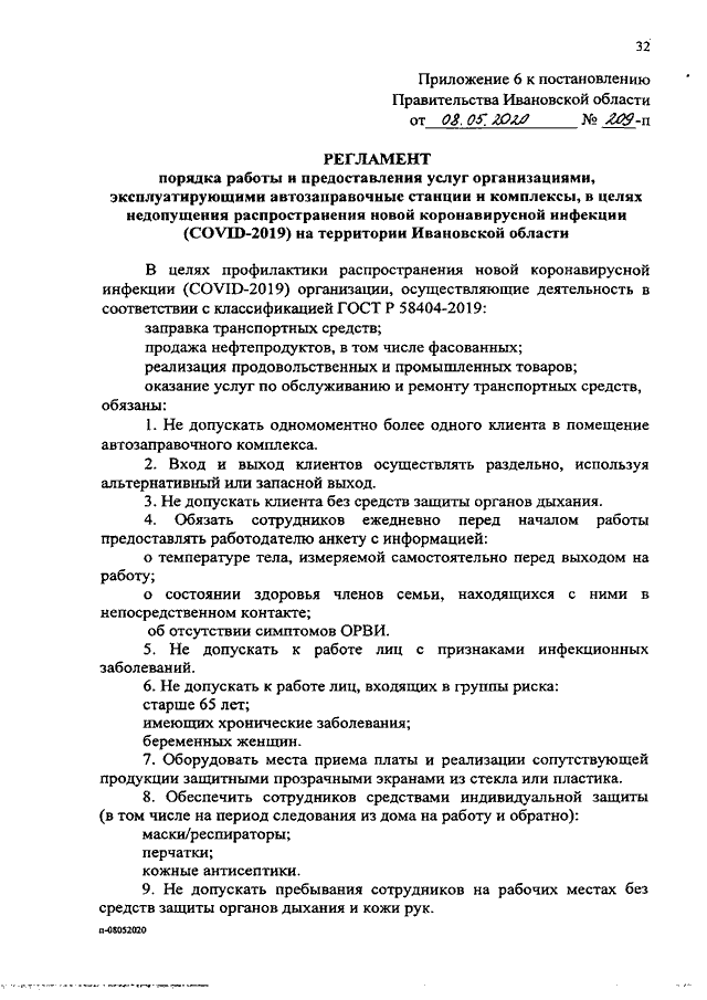 Постановление Правительства Ивановской области от 08.05.2020 N 209-п "Об утверждении регламентов по проведению профилактических мероприятий и дезинфекции в целях недопущения распространения новой коронавирусной инфекции (COVID-2019) на территории Ивановской области" (вместе с "Регламентом порядка работы предприятий промышленности в целях недопущения распространения новой коронавирусной инфекции (COVID-2019) на территории Ивановской области", "Регламентом порядка работы предприятий пищевой промышленности в целях недопущения распространения новой коронавирусной инфекции (COVID-2019) на территории Ивановской области", "Регламентом порядка работы предприятий текстильной промышленности в целях недопущения распространения новой коронавирусной инфекции (COVID-2019) на территории Ивановской области", "Регламентом порядка работы швейных предприятий в целях недопущения распространения новой коронавирусной инфекции (COVID-2019) на территории Ивановской области", "Регламентом порядка работы и предоставления услуг по перевозке пассажиров и багажа автомобильным транспортом и городским наземным электрическим транспортом в целях недопущения распространения новой коронавирусной инфекции (COVID-2019) на территории Ивановской области", "Регламентом порядка работы и предоставления услуг организациями, эксплуатирующими автозаправочные станции и комплексы, в целях недопущения распространения новой коронавирусной инфекции (COVID-2019) на территории Ивановской области", "Регламентом порядка работы и предоставления услуг по перевозке пассажиров и багажа легковым такси в целях недопущения распространения новой коронавирусной инфекции (COVID-2019) на территории Ивановской области", "Регламентом порядка работы предприятий сферы услуг в целях недопущения распространения новой коронавирусной инфекции (COVID-2019) на территории Ивановской области", "Регламентом порядка работы образовательных организаций, реализующих основные образовательные программы дошкольного образования, в целях недопущения распространения новой коронавирусной инфекции (COVID-19) на территории Ивановской области", "Регламентом порядка работы по проведению профилактических мероприятий и дезинфекции организаций, оказывающих парикмахерские и косметические услуги, в целях недопущения распространения новой коронавирусной инфекции (COVID-2019) на территории Ивановской области", "Регламентом порядка работы объектов розничной торговли продовольственных и непродовольственных товаров в целях недопущения распространения новой коронавирусной инфекции (COVID-2019) на территории Ивановской области", "Регламентом порядка работы многофункциональных центров предоставления государственных и муниципальных услуг (МФЦ) в целях недопущения распространения новой коронавирусной инфекции (COVID-2019) на территории Ивановской области")
