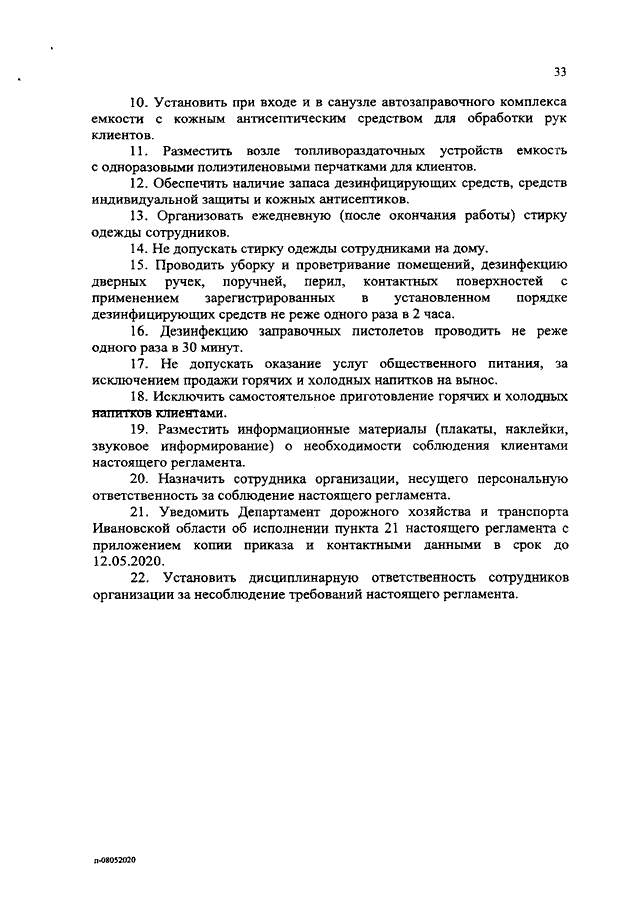 Постановление Правительства Ивановской области от 08.05.2020 N 209-п "Об утверждении регламентов по проведению профилактических мероприятий и дезинфекции в целях недопущения распространения новой коронавирусной инфекции (COVID-2019) на территории Ивановской области" (вместе с "Регламентом порядка работы предприятий промышленности в целях недопущения распространения новой коронавирусной инфекции (COVID-2019) на территории Ивановской области", "Регламентом порядка работы предприятий пищевой промышленности в целях недопущения распространения новой коронавирусной инфекции (COVID-2019) на территории Ивановской области", "Регламентом порядка работы предприятий текстильной промышленности в целях недопущения распространения новой коронавирусной инфекции (COVID-2019) на территории Ивановской области", "Регламентом порядка работы швейных предприятий в целях недопущения распространения новой коронавирусной инфекции (COVID-2019) на территории Ивановской области", "Регламентом порядка работы и предоставления услуг по перевозке пассажиров и багажа автомобильным транспортом и городским наземным электрическим транспортом в целях недопущения распространения новой коронавирусной инфекции (COVID-2019) на территории Ивановской области", "Регламентом порядка работы и предоставления услуг организациями, эксплуатирующими автозаправочные станции и комплексы, в целях недопущения распространения новой коронавирусной инфекции (COVID-2019) на территории Ивановской области", "Регламентом порядка работы и предоставления услуг по перевозке пассажиров и багажа легковым такси в целях недопущения распространения новой коронавирусной инфекции (COVID-2019) на территории Ивановской области", "Регламентом порядка работы предприятий сферы услуг в целях недопущения распространения новой коронавирусной инфекции (COVID-2019) на территории Ивановской области", "Регламентом порядка работы образовательных организаций, реализующих основные образовательные программы дошкольного образования, в целях недопущения распространения новой коронавирусной инфекции (COVID-19) на территории Ивановской области", "Регламентом порядка работы по проведению профилактических мероприятий и дезинфекции организаций, оказывающих парикмахерские и косметические услуги, в целях недопущения распространения новой коронавирусной инфекции (COVID-2019) на территории Ивановской области", "Регламентом порядка работы объектов розничной торговли продовольственных и непродовольственных товаров в целях недопущения распространения новой коронавирусной инфекции (COVID-2019) на территории Ивановской области", "Регламентом порядка работы многофункциональных центров предоставления государственных и муниципальных услуг (МФЦ) в целях недопущения распространения новой коронавирусной инфекции (COVID-2019) на территории Ивановской области")