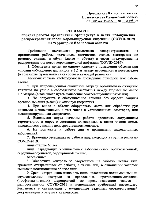 Постановление Правительства Ивановской области от 08.05.2020 N 209-п "Об утверждении регламентов по проведению профилактических мероприятий и дезинфекции в целях недопущения распространения новой коронавирусной инфекции (COVID-2019) на территории Ивановской области" (вместе с "Регламентом порядка работы предприятий промышленности в целях недопущения распространения новой коронавирусной инфекции (COVID-2019) на территории Ивановской области", "Регламентом порядка работы предприятий пищевой промышленности в целях недопущения распространения новой коронавирусной инфекции (COVID-2019) на территории Ивановской области", "Регламентом порядка работы предприятий текстильной промышленности в целях недопущения распространения новой коронавирусной инфекции (COVID-2019) на территории Ивановской области", "Регламентом порядка работы швейных предприятий в целях недопущения распространения новой коронавирусной инфекции (COVID-2019) на территории Ивановской области", "Регламентом порядка работы и предоставления услуг по перевозке пассажиров и багажа автомобильным транспортом и городским наземным электрическим транспортом в целях недопущения распространения новой коронавирусной инфекции (COVID-2019) на территории Ивановской области", "Регламентом порядка работы и предоставления услуг организациями, эксплуатирующими автозаправочные станции и комплексы, в целях недопущения распространения новой коронавирусной инфекции (COVID-2019) на территории Ивановской области", "Регламентом порядка работы и предоставления услуг по перевозке пассажиров и багажа легковым такси в целях недопущения распространения новой коронавирусной инфекции (COVID-2019) на территории Ивановской области", "Регламентом порядка работы предприятий сферы услуг в целях недопущения распространения новой коронавирусной инфекции (COVID-2019) на территории Ивановской области", "Регламентом порядка работы образовательных организаций, реализующих основные образовательные программы дошкольного образования, в целях недопущения распространения новой коронавирусной инфекции (COVID-19) на территории Ивановской области", "Регламентом порядка работы по проведению профилактических мероприятий и дезинфекции организаций, оказывающих парикмахерские и косметические услуги, в целях недопущения распространения новой коронавирусной инфекции (COVID-2019) на территории Ивановской области", "Регламентом порядка работы объектов розничной торговли продовольственных и непродовольственных товаров в целях недопущения распространения новой коронавирусной инфекции (COVID-2019) на территории Ивановской области", "Регламентом порядка работы многофункциональных центров предоставления государственных и муниципальных услуг (МФЦ) в целях недопущения распространения новой коронавирусной инфекции (COVID-2019) на территории Ивановской области")