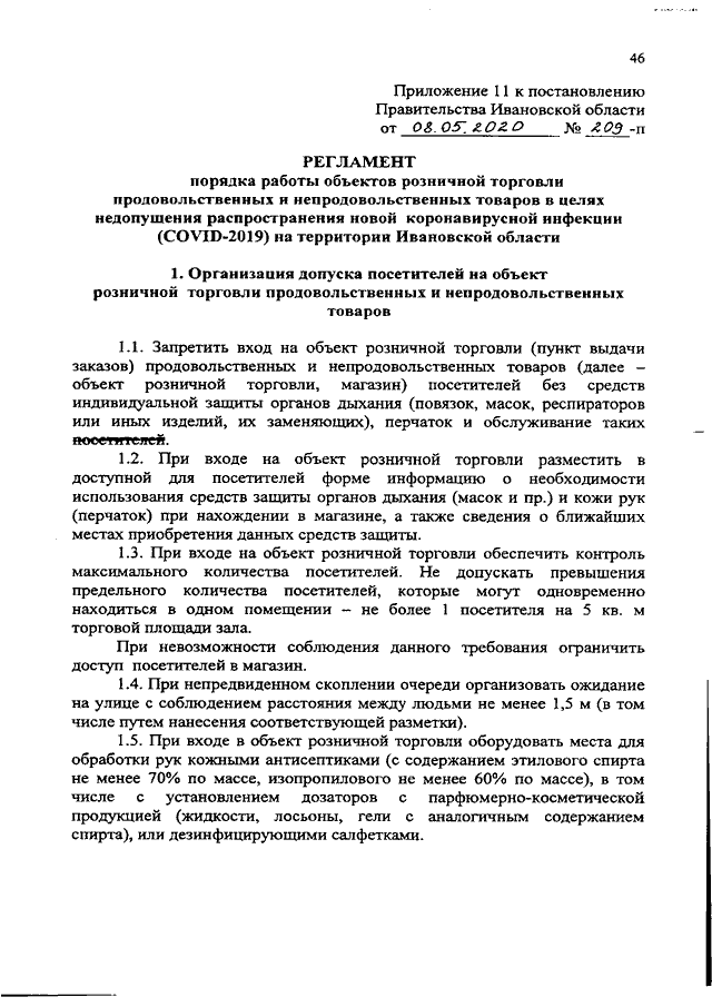 Постановление Правительства Ивановской области от 08.05.2020 N 209-п "Об утверждении регламентов по проведению профилактических мероприятий и дезинфекции в целях недопущения распространения новой коронавирусной инфекции (COVID-2019) на территории Ивановской области" (вместе с "Регламентом порядка работы предприятий промышленности в целях недопущения распространения новой коронавирусной инфекции (COVID-2019) на территории Ивановской области", "Регламентом порядка работы предприятий пищевой промышленности в целях недопущения распространения новой коронавирусной инфекции (COVID-2019) на территории Ивановской области", "Регламентом порядка работы предприятий текстильной промышленности в целях недопущения распространения новой коронавирусной инфекции (COVID-2019) на территории Ивановской области", "Регламентом порядка работы швейных предприятий в целях недопущения распространения новой коронавирусной инфекции (COVID-2019) на территории Ивановской области", "Регламентом порядка работы и предоставления услуг по перевозке пассажиров и багажа автомобильным транспортом и городским наземным электрическим транспортом в целях недопущения распространения новой коронавирусной инфекции (COVID-2019) на территории Ивановской области", "Регламентом порядка работы и предоставления услуг организациями, эксплуатирующими автозаправочные станции и комплексы, в целях недопущения распространения новой коронавирусной инфекции (COVID-2019) на территории Ивановской области", "Регламентом порядка работы и предоставления услуг по перевозке пассажиров и багажа легковым такси в целях недопущения распространения новой коронавирусной инфекции (COVID-2019) на территории Ивановской области", "Регламентом порядка работы предприятий сферы услуг в целях недопущения распространения новой коронавирусной инфекции (COVID-2019) на территории Ивановской области", "Регламентом порядка работы образовательных организаций, реализующих основные образовательные программы дошкольного образования, в целях недопущения распространения новой коронавирусной инфекции (COVID-19) на территории Ивановской области", "Регламентом порядка работы по проведению профилактических мероприятий и дезинфекции организаций, оказывающих парикмахерские и косметические услуги, в целях недопущения распространения новой коронавирусной инфекции (COVID-2019) на территории Ивановской области", "Регламентом порядка работы объектов розничной торговли продовольственных и непродовольственных товаров в целях недопущения распространения новой коронавирусной инфекции (COVID-2019) на территории Ивановской области", "Регламентом порядка работы многофункциональных центров предоставления государственных и муниципальных услуг (МФЦ) в целях недопущения распространения новой коронавирусной инфекции (COVID-2019) на территории Ивановской области")