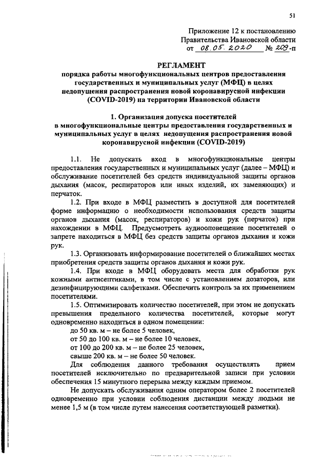 Постановление Правительства Ивановской области от 08.05.2020 N 209-п "Об утверждении регламентов по проведению профилактических мероприятий и дезинфекции в целях недопущения распространения новой коронавирусной инфекции (COVID-2019) на территории Ивановской области" (вместе с "Регламентом порядка работы предприятий промышленности в целях недопущения распространения новой коронавирусной инфекции (COVID-2019) на территории Ивановской области", "Регламентом порядка работы предприятий пищевой промышленности в целях недопущения распространения новой коронавирусной инфекции (COVID-2019) на территории Ивановской области", "Регламентом порядка работы предприятий текстильной промышленности в целях недопущения распространения новой коронавирусной инфекции (COVID-2019) на территории Ивановской области", "Регламентом порядка работы швейных предприятий в целях недопущения распространения новой коронавирусной инфекции (COVID-2019) на территории Ивановской области", "Регламентом порядка работы и предоставления услуг по перевозке пассажиров и багажа автомобильным транспортом и городским наземным электрическим транспортом в целях недопущения распространения новой коронавирусной инфекции (COVID-2019) на территории Ивановской области", "Регламентом порядка работы и предоставления услуг организациями, эксплуатирующими автозаправочные станции и комплексы, в целях недопущения распространения новой коронавирусной инфекции (COVID-2019) на территории Ивановской области", "Регламентом порядка работы и предоставления услуг по перевозке пассажиров и багажа легковым такси в целях недопущения распространения новой коронавирусной инфекции (COVID-2019) на территории Ивановской области", "Регламентом порядка работы предприятий сферы услуг в целях недопущения распространения новой коронавирусной инфекции (COVID-2019) на территории Ивановской области", "Регламентом порядка работы образовательных организаций, реализующих основные образовательные программы дошкольного образования, в целях недопущения распространения новой коронавирусной инфекции (COVID-19) на территории Ивановской области", "Регламентом порядка работы по проведению профилактических мероприятий и дезинфекции организаций, оказывающих парикмахерские и косметические услуги, в целях недопущения распространения новой коронавирусной инфекции (COVID-2019) на территории Ивановской области", "Регламентом порядка работы объектов розничной торговли продовольственных и непродовольственных товаров в целях недопущения распространения новой коронавирусной инфекции (COVID-2019) на территории Ивановской области", "Регламентом порядка работы многофункциональных центров предоставления государственных и муниципальных услуг (МФЦ) в целях недопущения распространения новой коронавирусной инфекции (COVID-2019) на территории Ивановской области")