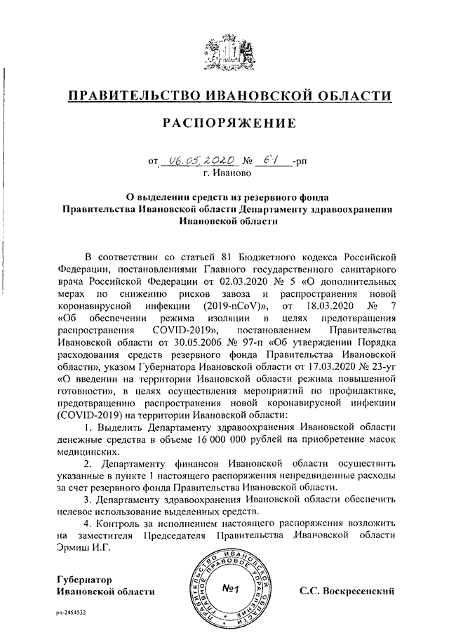 Распоряжение Правительства Ивановской области от 06.05.2020 N 61-рп "О выделении средств из резервного фонда Правительства Ивановской области Департаменту здравоохранения Ивановской области"