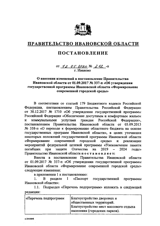 Постановление Правительства Ивановской области от 12.05.2020 N 212-п "О внесении изменений в постановление Правительства Ивановской области от 01.09.2017 N 337-п "Об утверждении государственной программы Ивановской области "Формирование современной городской среды" (вместе с "Адресным перечнем дворовых территорий, нуждающихся в благоустройстве (с учетом их физического состояния), исходя из минимального перечня работ по благоустройству", "Адресным перечнем объектов недвижимого имущества (включая объекты незавершенного строительства) и земельных участков, находящихся в собственности (пользовании) юридических лиц и индивидуальных предпринимателей", "Подпрограммой "Увековечение памяти погибших при защите Отечества")