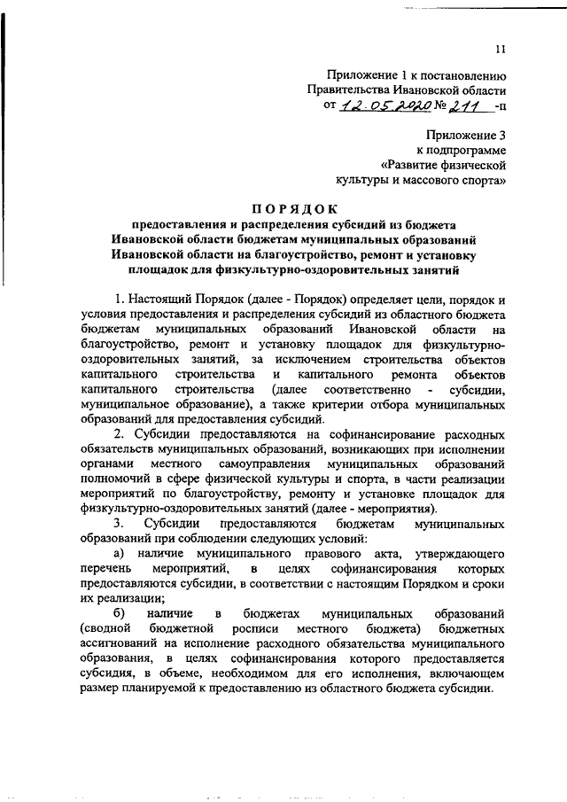 Постановление Правительства Ивановской области от 12.05.2020 N 211-п "О внесении изменений в постановление Правительства Ивановской области от 18.02.2016 N 43-п "Об утверждении государственной программы Ивановской области "Развитие физической культуры и спорта в Ивановской области" (вместе с "Порядком предоставления и распределения субсидий из бюджета Ивановской области бюджетам муниципальных образований Ивановской области на благоустройство, ремонт и установку площадок для физкультурно-оздоровительных занятий", "Порядком предоставления и распределения субсидий бюджетам муниципальных образований Ивановской области на оснащение объектов спортивной инфраструктуры спортивно-технологическим оборудованием (создание или модернизация физкультурно-оздоровительных комплексов открытого типа и (или) физкультурно-оздоровительных комплексов для центров развития внешкольного спорта)")