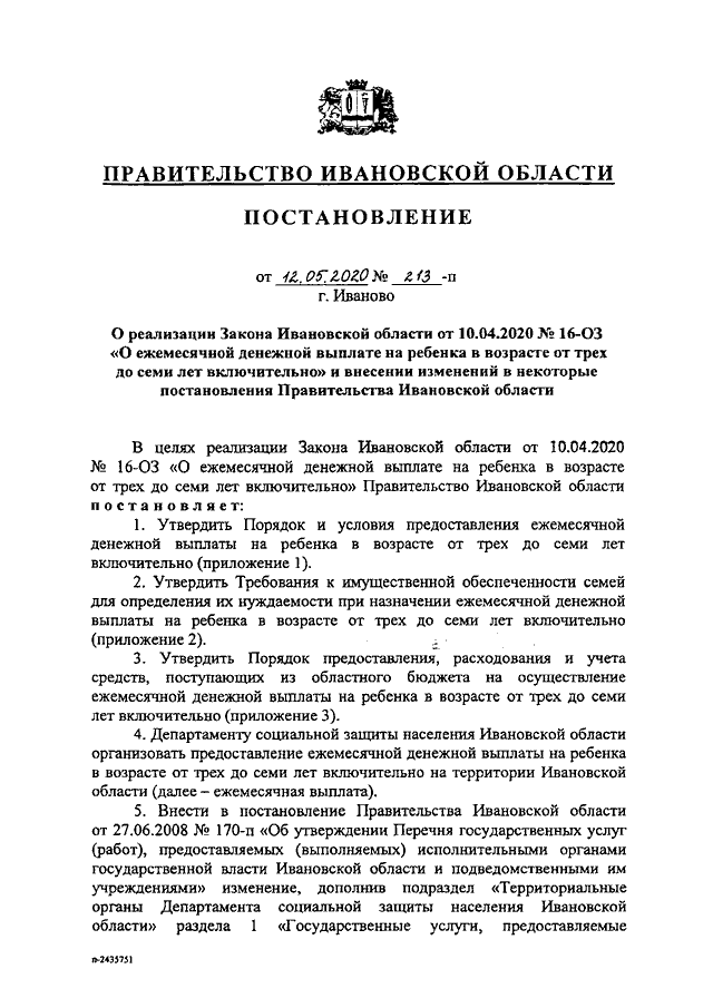 Постановление Правительства Ивановской области от 12.05.2020 N 213-п "О реализации Закона Ивановской области от 10.04.2020 N 16-ОЗ "О ежемесячной денежной выплате на ребенка в возрасте от трех до семи лет включительно" и внесении изменений в некоторые постановления Правительства Ивановской области" (вместе с "Порядком и условиями предоставления ежемесячной денежной выплаты на ребенка в возрасте от трех до семи лет включительно", "Требованиями к имущественной обеспеченности семей для определения их нуждаемости при назначении ежемесячной денежной выплаты на ребенка в возрасте от трех до семи лет включительно", "Порядком предоставления, расходования и учета средств, поступающих из областного бюджета на осуществление ежемесячной денежной выплаты на ребенка в возрасте от трех до семи лет включительно")