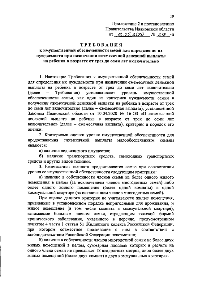 Постановление Правительства Ивановской области от 12.05.2020 N 213-п "О реализации Закона Ивановской области от 10.04.2020 N 16-ОЗ "О ежемесячной денежной выплате на ребенка в возрасте от трех до семи лет включительно" и внесении изменений в некоторые постановления Правительства Ивановской области" (вместе с "Порядком и условиями предоставления ежемесячной денежной выплаты на ребенка в возрасте от трех до семи лет включительно", "Требованиями к имущественной обеспеченности семей для определения их нуждаемости при назначении ежемесячной денежной выплаты на ребенка в возрасте от трех до семи лет включительно", "Порядком предоставления, расходования и учета средств, поступающих из областного бюджета на осуществление ежемесячной денежной выплаты на ребенка в возрасте от трех до семи лет включительно")