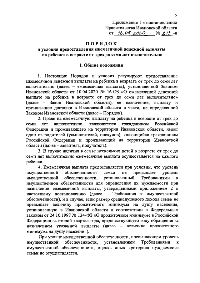 Постановление Правительства Ивановской области от 12.05.2020 N 213-п "О реализации Закона Ивановской области от 10.04.2020 N 16-ОЗ "О ежемесячной денежной выплате на ребенка в возрасте от трех до семи лет включительно" и внесении изменений в некоторые постановления Правительства Ивановской области" (вместе с "Порядком и условиями предоставления ежемесячной денежной выплаты на ребенка в возрасте от трех до семи лет включительно", "Требованиями к имущественной обеспеченности семей для определения их нуждаемости при назначении ежемесячной денежной выплаты на ребенка в возрасте от трех до семи лет включительно", "Порядком предоставления, расходования и учета средств, поступающих из областного бюджета на осуществление ежемесячной денежной выплаты на ребенка в возрасте от трех до семи лет включительно")