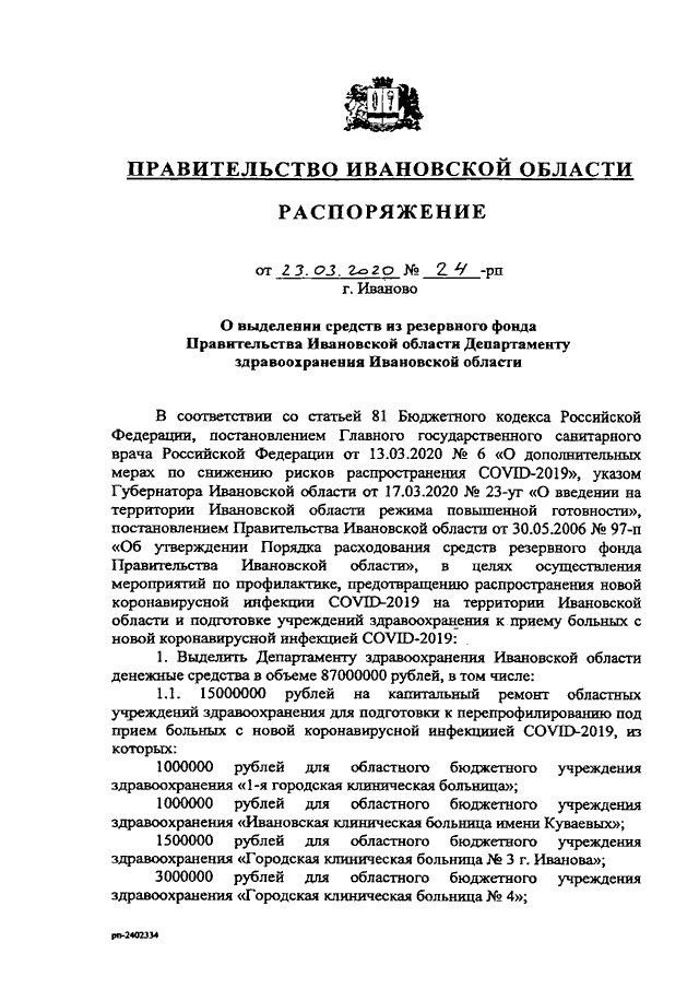 Распоряжение Правительства Ивановской области от 23.03.2020 N 24-рп "О выделении средств из резервного фонда Правительства Ивановской области Департаменту здравоохранения Ивановской области"