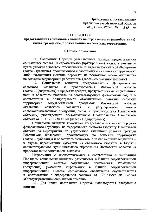 Постановление Правительства Ивановской области от 15.05.2020 N 219-п "О внесении изменений в постановление Правительства Ивановской области от 01.04.2014 N 111-п "О Порядке предоставления социальных выплат на строительство (приобретение) жилья гражданам, проживающим в сельской местности, в том числе молодым семьям и молодым специалистам" (вместе с "Порядком предоставления социальных выплат на строительство (приобретение) жилья гражданам, проживающим на сельских территориях")
