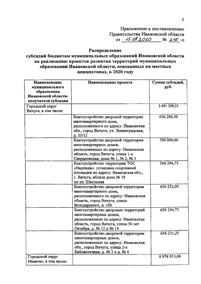 Постановление Правительства Ивановской области от 15.05.2020 N 216-п "О распределении субсидий бюджетам муниципальных образований Ивановской области на реализацию проектов развития территорий муниципальных образований Ивановской области, основанных на местных инициативах, в 2020 году"