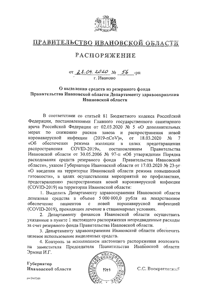 Распоряжение Правительства Ивановской области от 28.04.2020 N 56-рп "О выделении средств из резервного фонда Правительства Ивановской области Департаменту здравоохранения Ивановской области"