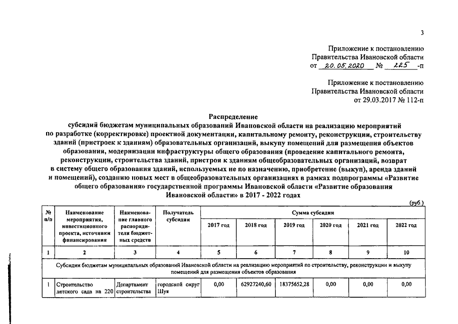 Постановление Правительства Ивановской области от 20.05.2020 N 225-п "О внесении изменения в постановление Правительства Ивановской области от 29.03.2017 N 112-п "О распределении субсидий бюджетам муниципальных образований Ивановской области на реализацию мероприятий по разработке (корректировке) проектной документации, капитальному ремонту, реконструкции, строительству зданий (пристроек к зданиям) образовательных организаций, выкупу помещений для размещения объектов образования, модернизации инфраструктуры общего образования (проведение капитального ремонта, реконструкции, строительства зданий, пристроя к зданиям общеобразовательных организаций, возврат в систему общего образования зданий, используемых не по назначению, приобретение (выкуп), аренда зданий и помещений), созданию новых мест в общеобразовательных организациях в рамках подпрограммы "Развитие общего образования" государственной программы Ивановской области "Развитие образования Ивановской области" в 2017 - 2022 годах"