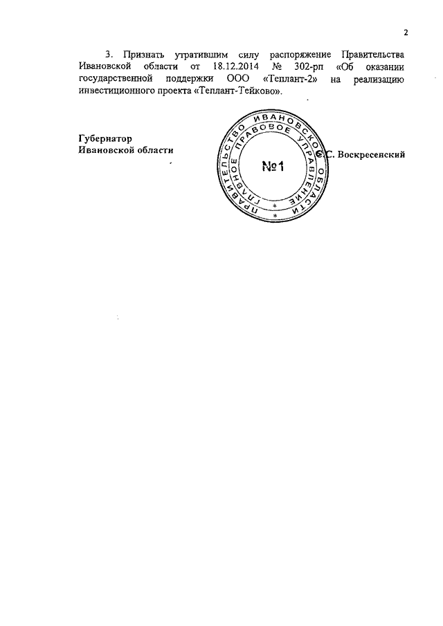 Распоряжение Правительства Ивановской области от 22.05.2020 N 69-рп "О досрочном прекращении государственной поддержки ООО "Теплант-2" и об исключении инвестиционного проекта "Теплант-Тейково" из государственного реестра инвестиционных проектов Ивановской области"