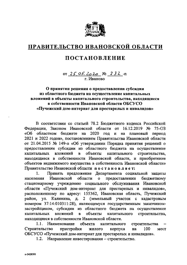Постановление Правительства Ивановской области от 25.05.2020 N 232-п "О принятии решения о предоставлении субсидии из областного бюджета на осуществление капитальных вложений в объекты капитального строительства, находящиеся в собственности Ивановской области ОБСУСО "Пучежский дом-интернат для престарелых и инвалидов"