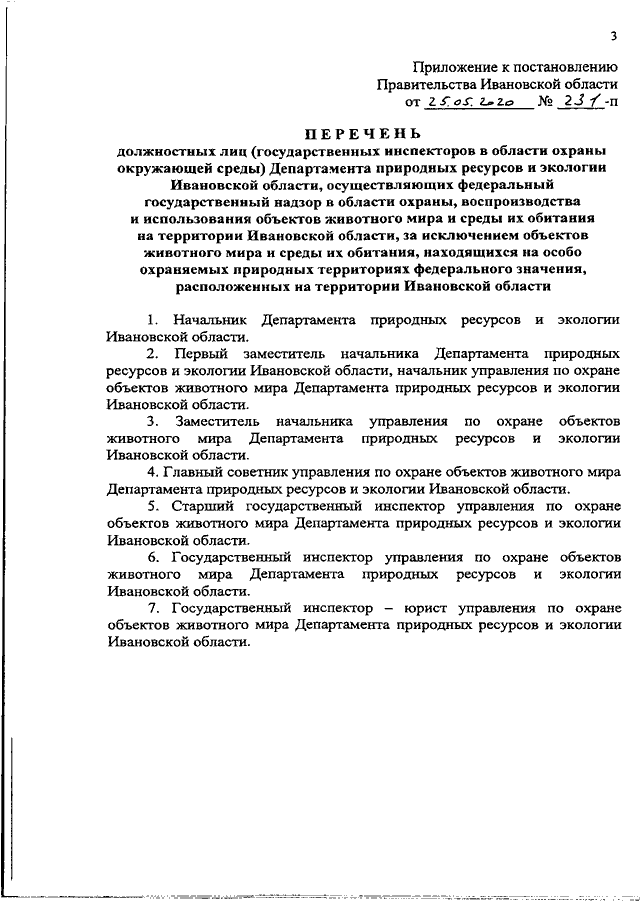 Постановление Правительства Ивановской области от 25.05.2020 N 231-п "Об утверждении перечня должностных лиц (государственных инспекторов в области охраны окружающей среды) Департамента природных ресурсов и экологии Ивановской области, осуществляющих федеральный государственный надзор в области охраны, воспроизводства и использования объектов животного мира и среды их обитания на территории Ивановской области, за исключением объектов животного мира и среды их обитания, находящихся на особо охраняемых природных территориях федерального значения, расположенных на территории Ивановской области"