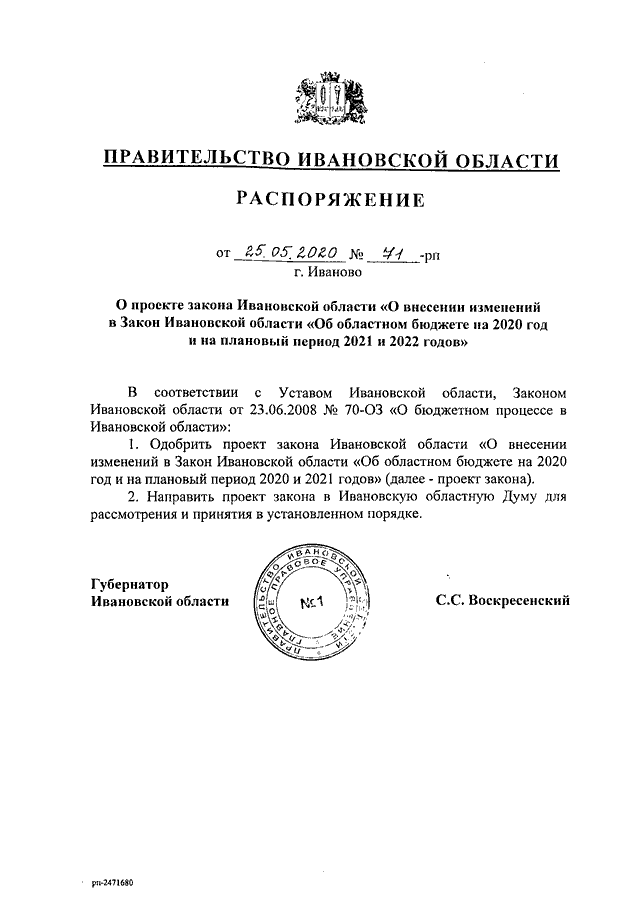Распоряжение Правительства Ивановской области от 25.05.2020 N 71-рп "О проекте закона Ивановской области "О внесении изменений в Закон Ивановской области "Об областном бюджете на 2020 год и на плановый период 2021 и 2022 годов"