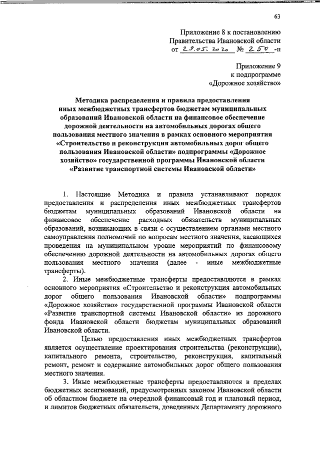 Постановление Правительства Ивановской области от 29.05.2020 N 250-п "О внесении изменений в постановление Правительства Ивановской области от 13.11.2013 N 447-п "Об утверждении государственной программы Ивановской области "Развитие транспортной системы Ивановской области" (вместе с "Методикой распределения и правилами предоставления иных межбюджетных трансфертов бюджетам муниципальных образований Ивановской области на финансовое обеспечение дорожной деятельности на автомобильных дорогах общего пользования местного значения в рамках основного мероприятия "Строительство и реконструкция автомобильных дорог общего пользования Ивановской области" подпрограммы "Дорожное хозяйство" государственной программы Ивановской области "Развитие транспортной системы Ивановской области")