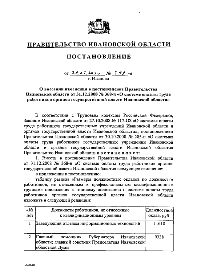 Постановление Правительства Ивановской области от 29.05.2020 N 249-п "О внесении изменения в постановление Правительства Ивановской области от 31.12.2008 N 368-п "О системе оплаты труда работников органов государственной власти Ивановской области"